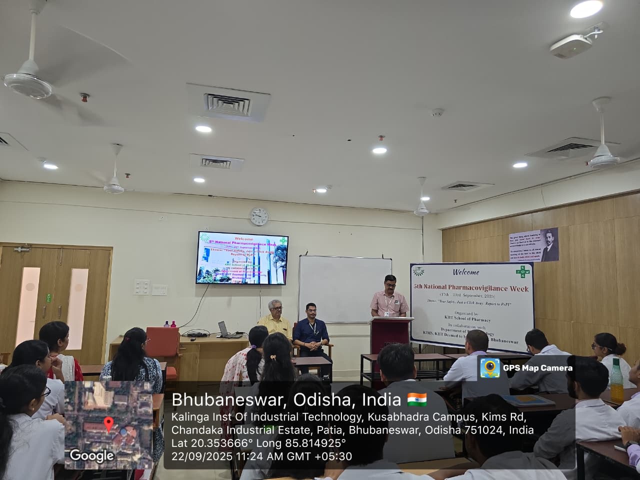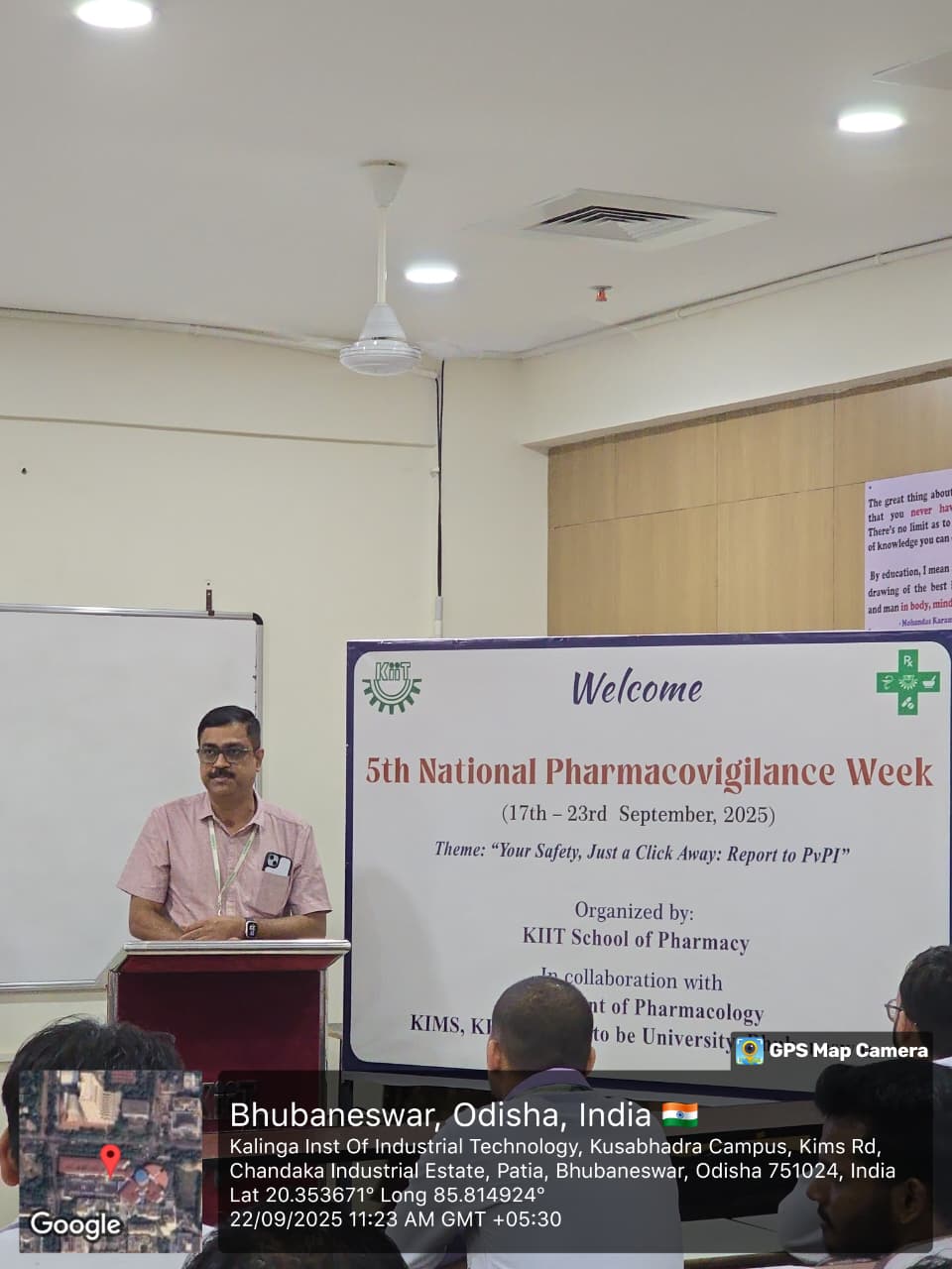 KIIT School of Pharmacy celebrated the 5thNational Pharmacovigilance Week on 22nd September 2025 with the theme “Your Safety, Just a Click Away: Report to PvPI.” The program, organized in collaboration with the Department of Pharmacology, aimed to promote awareness on drug safety and the importance of Adverse Drug Reaction (ADR) reporting among pharmacists. The event began with welcoming remarks from Dr. Biswaranjan Behera, Principal, KIIT School of Pharmacy, who emphasized the growing need for responsible pharmacovigilance practices and the role of pharmacists in strengthening patient safety in India. The session featured an insightful and highly informative lecture by Prof.(Dr.)MangalaCharan Das, Professor & HOD Department of Pharmacology, who elaborated on the scope of the Pharmacovigilance Programme of India (PvPI), the digital ease of ADR reporting, and the critical responsibility of pharmacy professionals in ensuring safe and rational medication use. The program was graced by Dr.RatikantaTripathy Associate Professor, Department of Pharmacology, along with faculty members and students. A Poster Making Competition on the theme was organized, receiving enthusiastic participation from students who showcased creative and insightful posters highlighting ADR reporting and patient safety. Certificates of participation were given to all participants, and the winners were awarded for their outstanding work. The event was smoothly anchored by Mrs. Jasma Jena. The ceremony concluded with a Vote of Thanks delivered by Dr.Pritipadma Panda, who acknowledged the contributions of the speaker, dignitaries, organizing committee, and students. The program successfully strengthened awareness on pharmacovigilance and reinforced KIIT School of Pharmacy’s commitment to fostering responsible and safety-oriented future healthcare professionals.